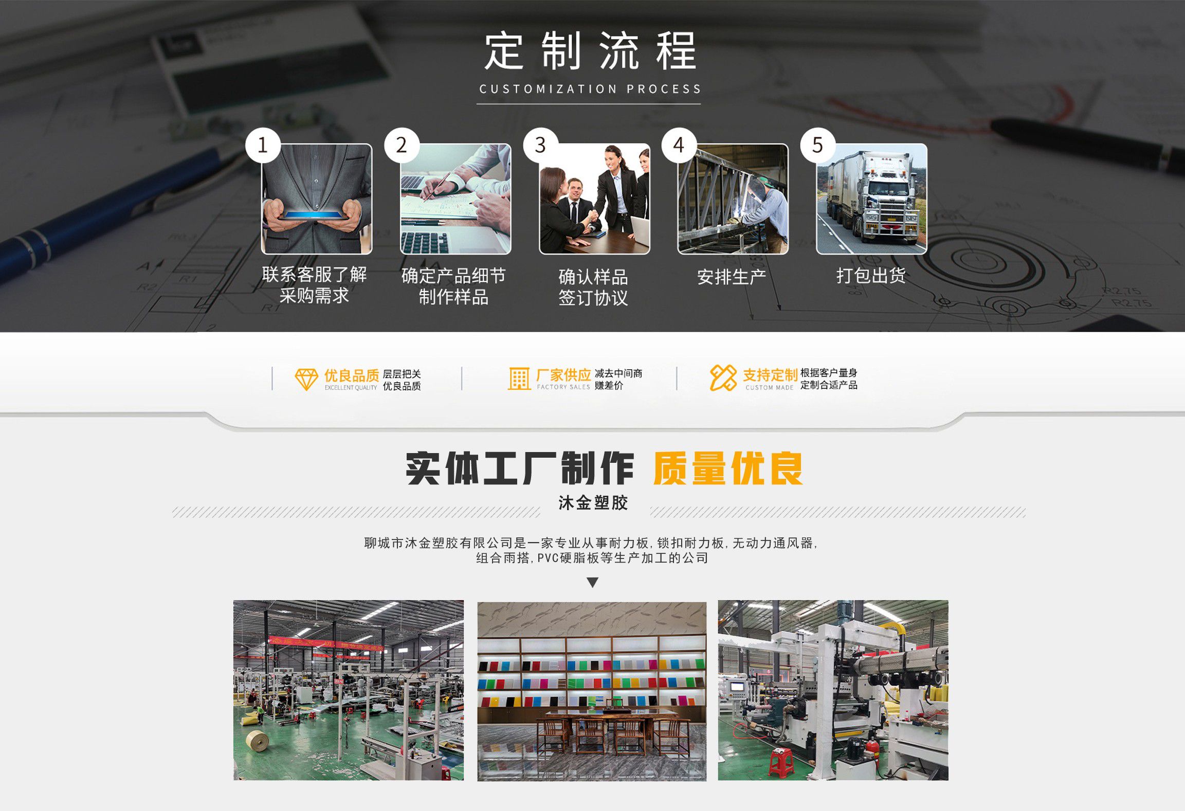 聊城市沐金塑膠有限公司注冊資金2180萬元,占地20000余平方,擁有自建廠房15000平方,員工100余名。10余年來,公司主營耐力板,鎖扣耐力板,耐力板深加工,無動力通風器,組合雨搭,PVC硬脂板,耐力板廠家等板材的發展戰略,逐漸成長為綜合性企業。 公司擁有多條板材共擠生產線,采用世界知名品牌進口原材料和先進工藝,依據完善的ISO9001質量管理體系和ISO14001環境管理體系,為產品的卓越品質提供了強有力的保證。憑借過硬的創新能力和堅實的硬件基礎,贏創已成為國內領先的熱塑性板材生產商,產品被廣泛應用于建筑業、農業、工業、廣告業、安防行業及DIY領域?! 」臼冀K致力于通過提供最優的板材應用解決方案,為客戶創造最高的價值;堅守創新、質量、靈活、服務和速度的核心價值觀;堅持“完美的產品需要完美服務的支持”的經營理念,努力實現成為世界領先的板材與解決方案供應商的夢想?! ≡谖磥?,公司將立足客戶需求,不斷改變和完善現有產品,拓展產品線和充分開發板材的應用領域,為客戶創造全方位的價值。同時更好地實現員工的價值,實現公司團隊的價值。我們將與您一起創贏未來! 企業使命:成為世界領先的板材與解決方案供應商。 公司愿景:通過提供最優的板材應用解決方案,為客戶創造最高的價值。 核心價值觀:質量...
